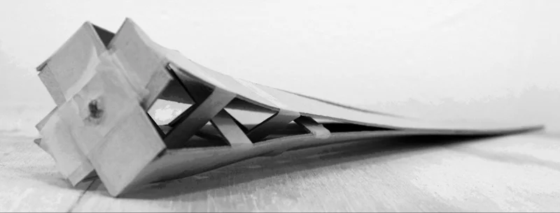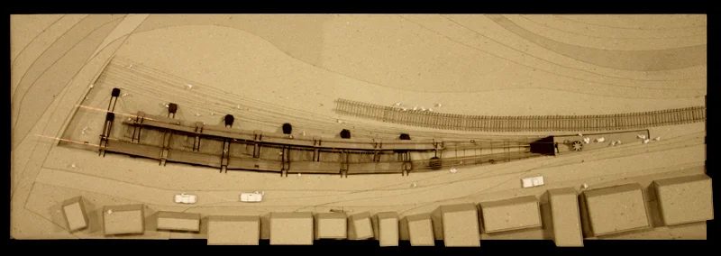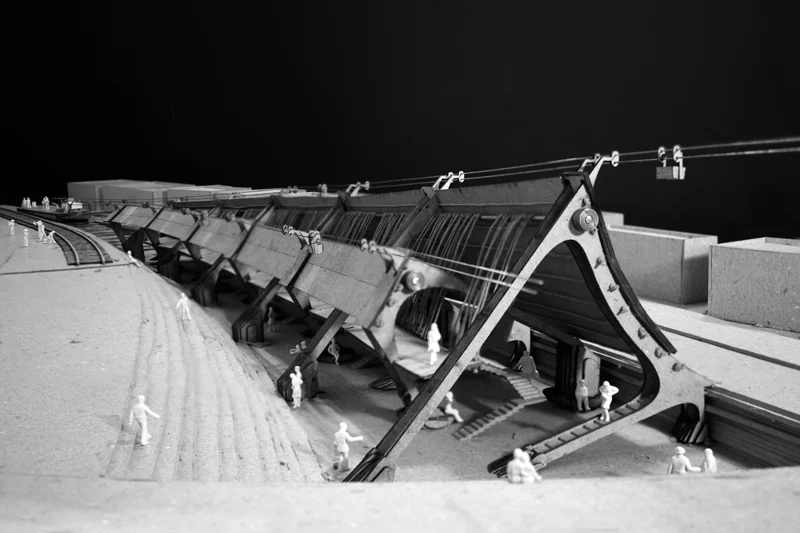 Reorienting the tracks to meet the incoming gondolas, the intervention creates a fusion of structural systems: the repetitive profiles of the tracks linked by a stabilizing rail blends with the aerial structure of the cable cars - wires supported by guides and carrying the weight of the two diverging skin surfaces.