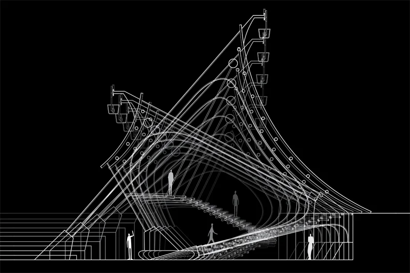 The structure expands over its length, transmuting a line in the ground into an infrastructural object, creating a complex interior space capable of accommodating all manner of public activities.