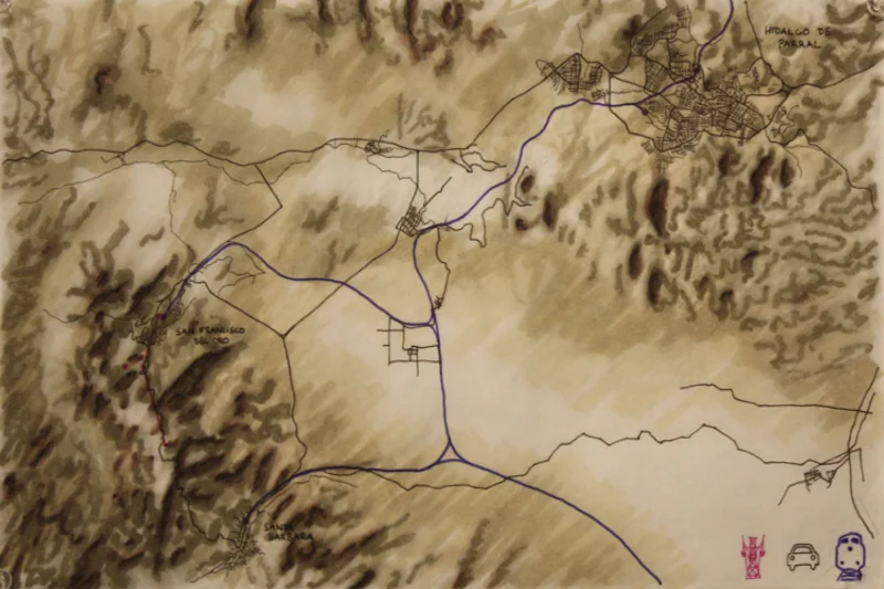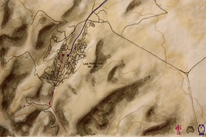 San Franciso del Oro, Mexico. A dead end stop of the Ferromex tail line. From the zinc and silver mines in the outlying hills, ore is brought to the refinery complex in the center of town via an elevated cable car system, distinct in the city's skyline. Sorted and extracted, the precious metals are then exported via train.