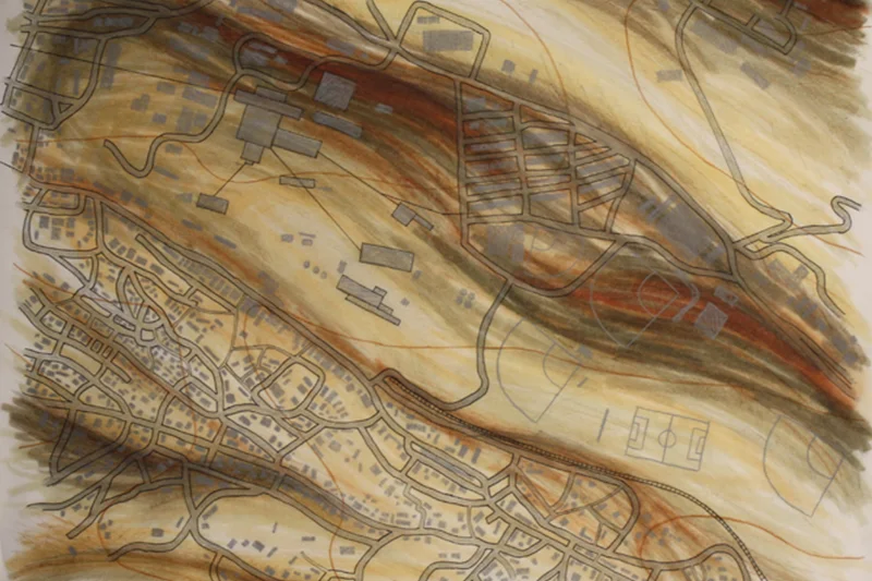 An intervention seeks to unite the terminus of the train tracks and the gondola system running throughout the city, bridging a discontinuity in the path of travel of materials from the mines to the end user.